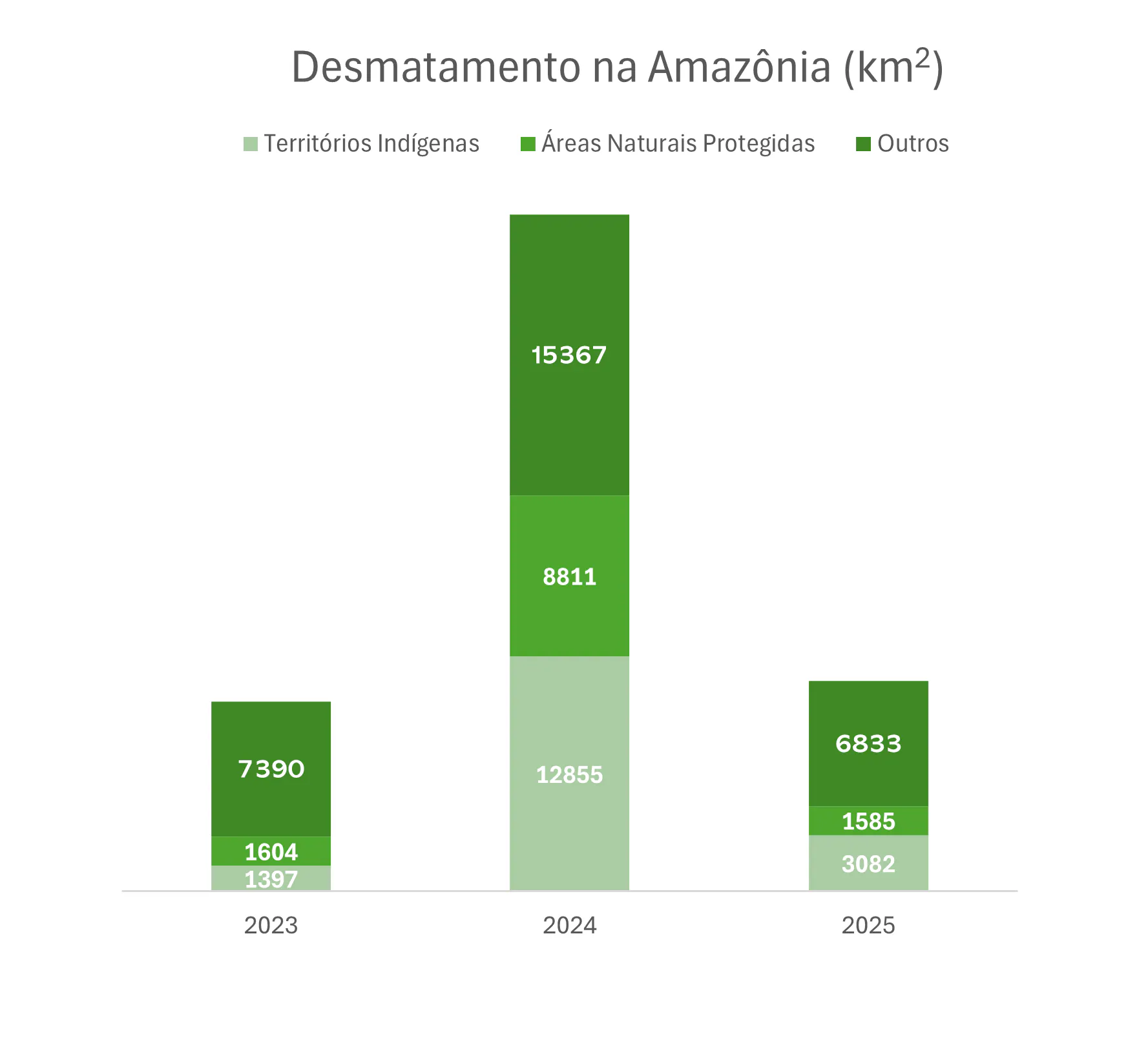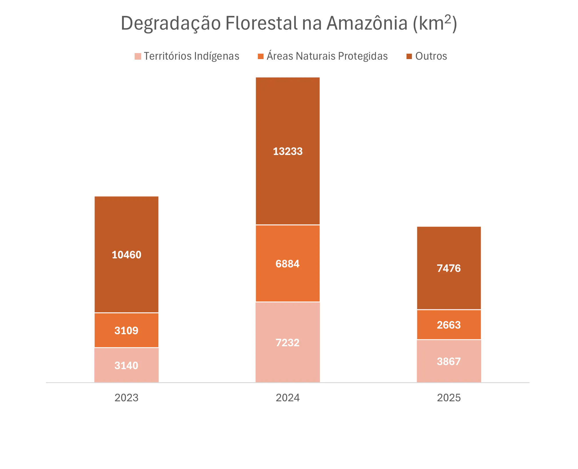 Em 2024, uma seca severa impulsionou incêndios florestais e agravou o desmatamento e a degradação da vegetação; em 2025, a área desmatada caiu 68% e a degradada 48%.